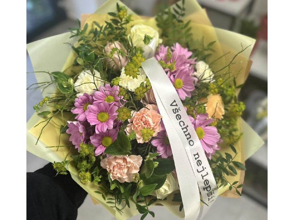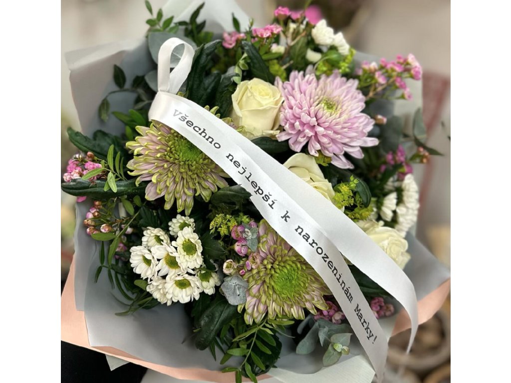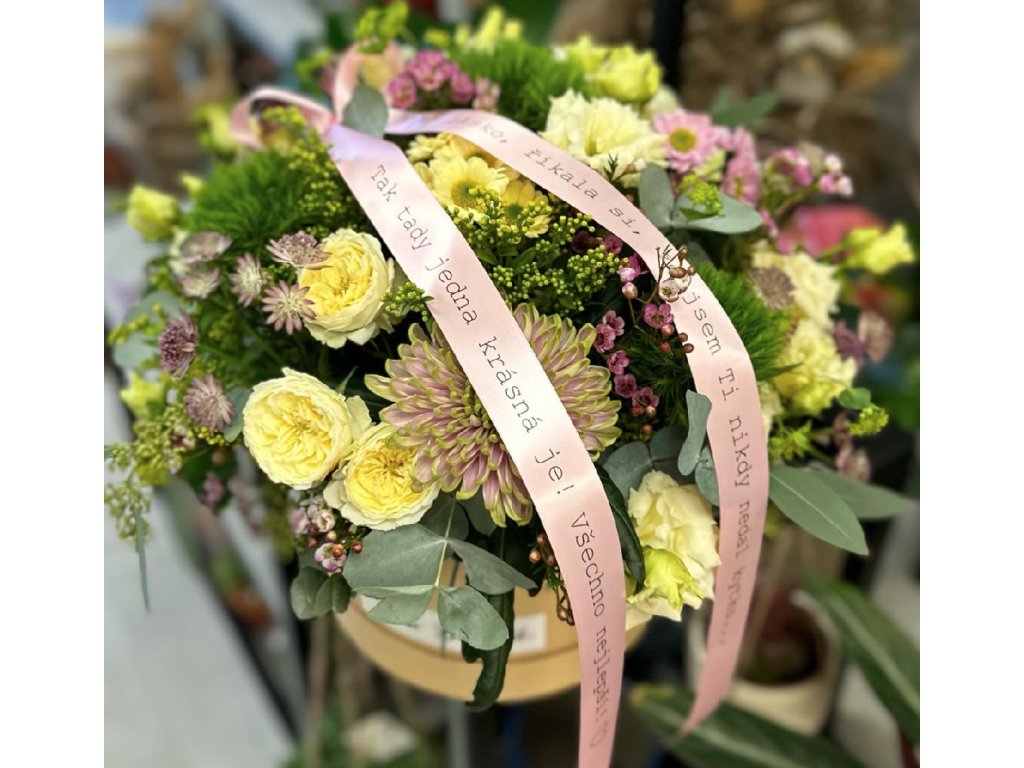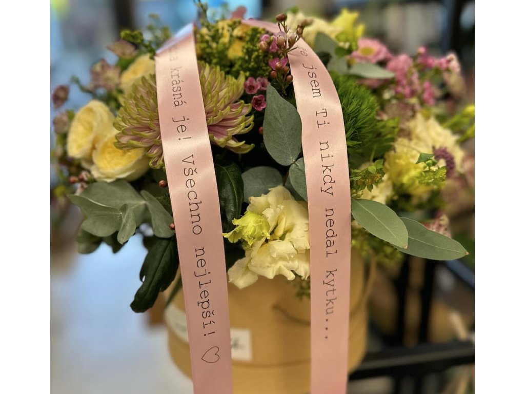 Využijte naší jedinečné nabídky - na stuhu Vám vytiskneme text, který perfektně vystihne situaci, pro kterou kytici nebo květinový box objednáváte. Obdarovaná osoba si tak přečte přání, milý vzkaz nebo třeba citát, který potěší.